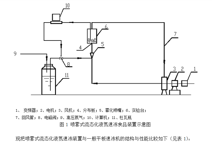 等進(jìn)行速凍研究,但采用噴霧式流態(tài)化液氮速凍裝置對(duì)果蔬進(jìn)行瞬時(shí)凍結(jié)的研究鮮見報(bào)道。